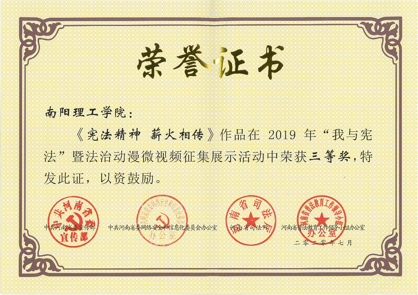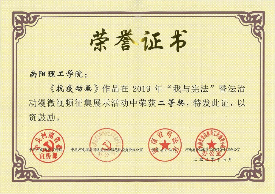 近日,河南省委宣传部、省委网络安全和信息化委员会办公室、省司法厅、省普法教育工作领导小组办公室就全省“我与宪法”暨法治动漫微视频征集大赛发布获奖通知,我校制作的《抗疫动画》、《宪法精神 薪火相传》微视频作品分别荣获全省二等奖和三等奖。