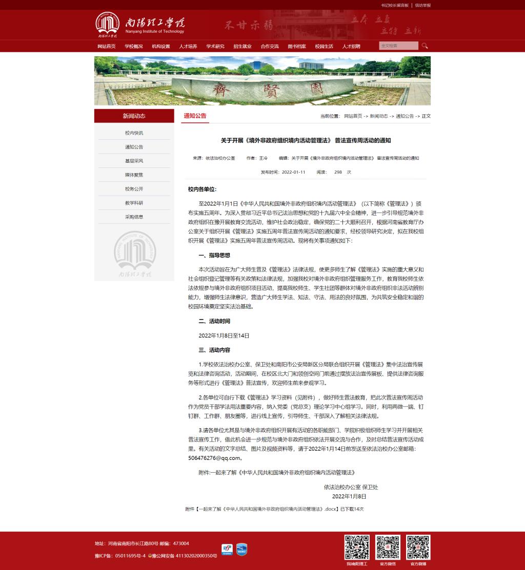 2022年1月1日是《中华人民共和国境外非政府组织境内活动管理法》(以下简称《管理法》)颁布实施五周年。为推进依法治校进程,加强我校对境外非政府组织管理服务工作,教育全校师生依法依规参与境外非政府组织项目活动,提高师生、学生社团等群体对境外非政府组织非法活动辨别能力,增强师生法律意识。我校于1月8日-14日,在全校范围通过多种途径开展《管理法》普法宣传周活动。