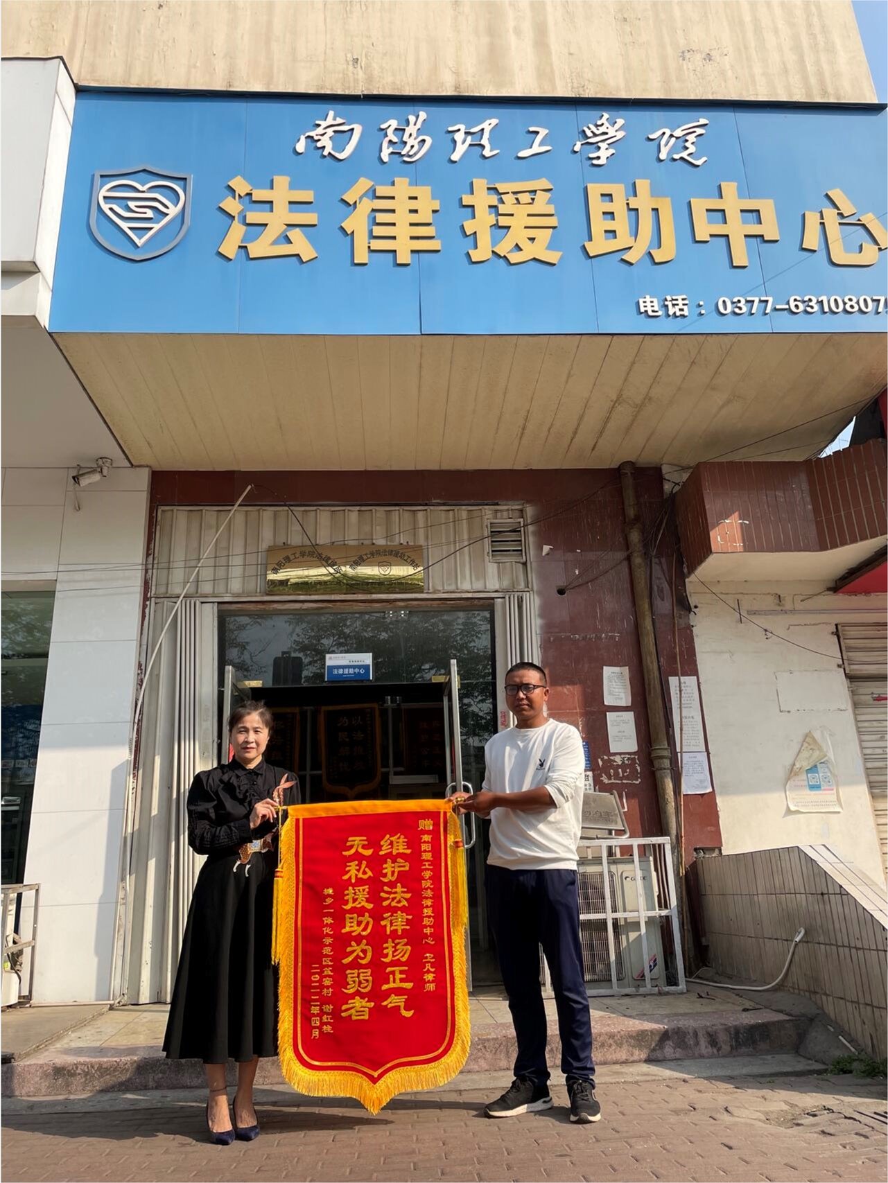 本网讯(特约记者/王冷)近日,城乡一体化盆窑村居民谢红柱送来了一面写有“维护法律扬正气,无私援助为弱者”的锦旗,表达对南阳理工学院法律援助中心和卫凡律师提供的法律援助表示由衷的感谢。