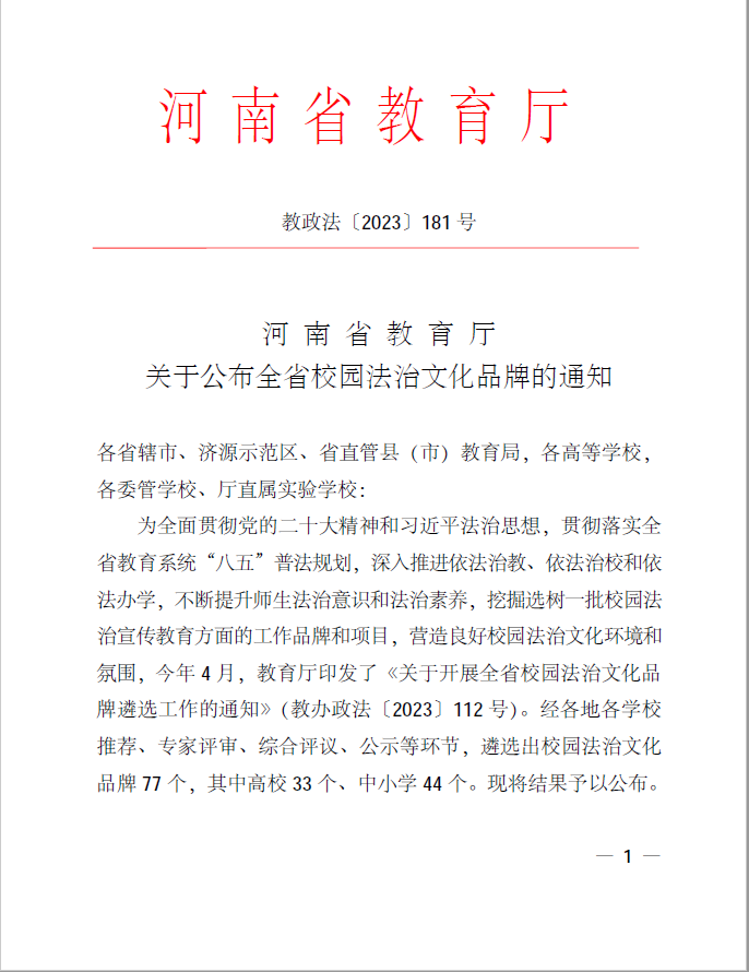 本网讯(记者/王冷)近日,河南省教育厅公布全省校园法治文化品牌遴选活动评审结果,我校“1+N”五维并举主题普法教育活动荣获全省校园法治文化品牌项目。