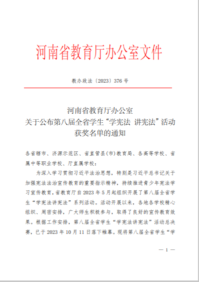 今年5月,河南省教育厅启动第八届全省学生“学宪法 讲宪法”系列活动后,学校依法治校办公室、学生处、团委和各教学院以该项赛事为抓手,主动谋划、精心组织、广泛动员,积极组织参加“宪法卫士”行动计划,组织全校大学生在教育部全国青少年普法网注册登记学习,争当“宪法卫士”,开展“学宪法 讲宪法”校级演讲比赛和知识竞赛等多项活动,在全校大学生中掀起了“学宪法 讲宪法”的新热潮。