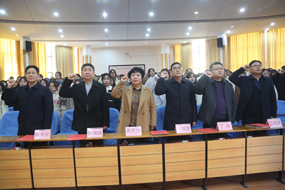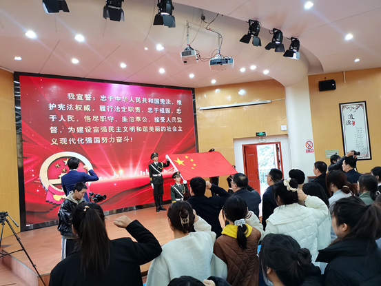 开幕式上还举行了集体宪法宣誓仪式。在国旗护卫队的护卫下,鲜艳的五星红旗绽放在会场主席台,领誓人手抚宪法,所有在场的师生右手举拳,面向国旗,在领誓人带领下高声宣誓。