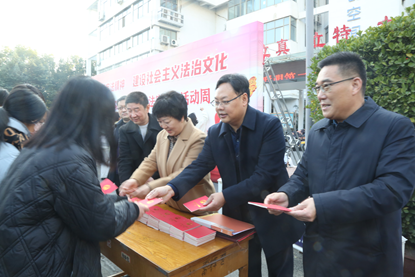 整个开幕式现场庄严神圣,在场的领导和师生代表们通过奏唱国歌、诵读宪法条文、集体宪法宣誓等活动进一步加深了对宪法的认识。宣誓后,师生们纷纷在宪法宣传周活动签名墙上留下自己的名字,并参观了宪法宣传系列展板。参会领导为学生代表发放《中华人民共和国宪法》手册。开幕式的最后,大家手举《宪法》,合影留念,共同纪念第十个宪法宣传日。
