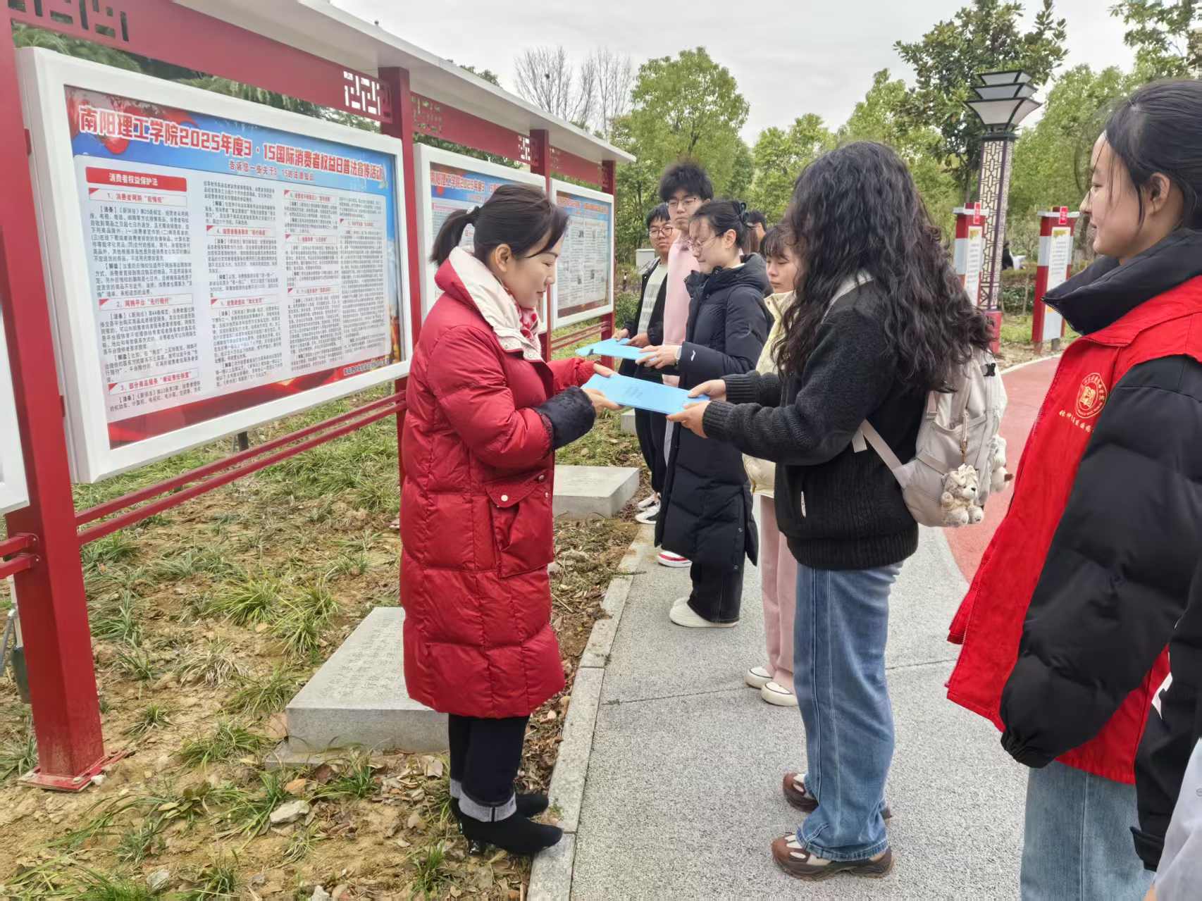 3月14日上午,依法治校办公室工作人员与生物与化学工程学院、张仲景国医国药学院师生代表在东南校区法治文化广场联合开展消费者权益日集中普法宣传,通过发放普法宣传资料、摆放宣传展板、法治答题活动等方式,向师生普及《消费者权益保护法》等法律法规,结合消费维权案例,现场为大家讲解了消费者所享有的权利、常见消费陷阱以及维权途径等内容,引导广大师生树立理性消费观念,增强依法维权意识。
