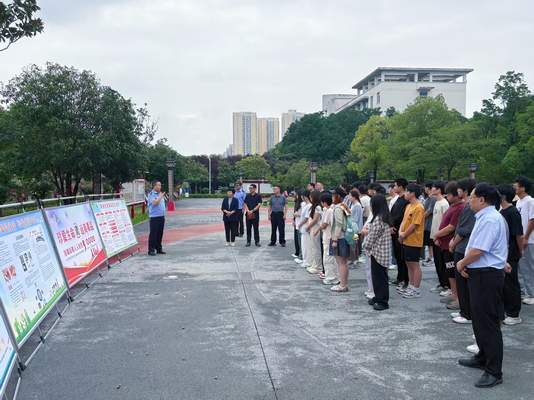6月26日上午,我校高芳放副校长与保卫处、依法治校办公室、土木工程学院负责人及师生代表在法治文化广场开展“6·26”国际禁毒日普法宣传活动,组织师生有序参观禁毒知识展板,发放防毒宣传手册。南阳市城乡一体化示范区公安分局经侦大队中队长搭配生动案例,向到场师生普及禁毒法律法规和防毒、戒毒知识。尤其是向同学们详细介绍了毒品的种类、特征、危害以及预防毒品的方法:从传统毒品鸦片、海洛因,到新型毒品冰毒、摇头丸,再到极具隐蔽性的第三代毒品,如“奶茶”“跳跳糖”“笑气”等,让师生们对毒品有了全面而清晰的认识。高校长和相关处室负责人与现场师生积极互动,通过知识问答等形式,传授识毒防毒方法,鼓励大家向身边人传播禁毒知识,在心中深植法治观念的种子。