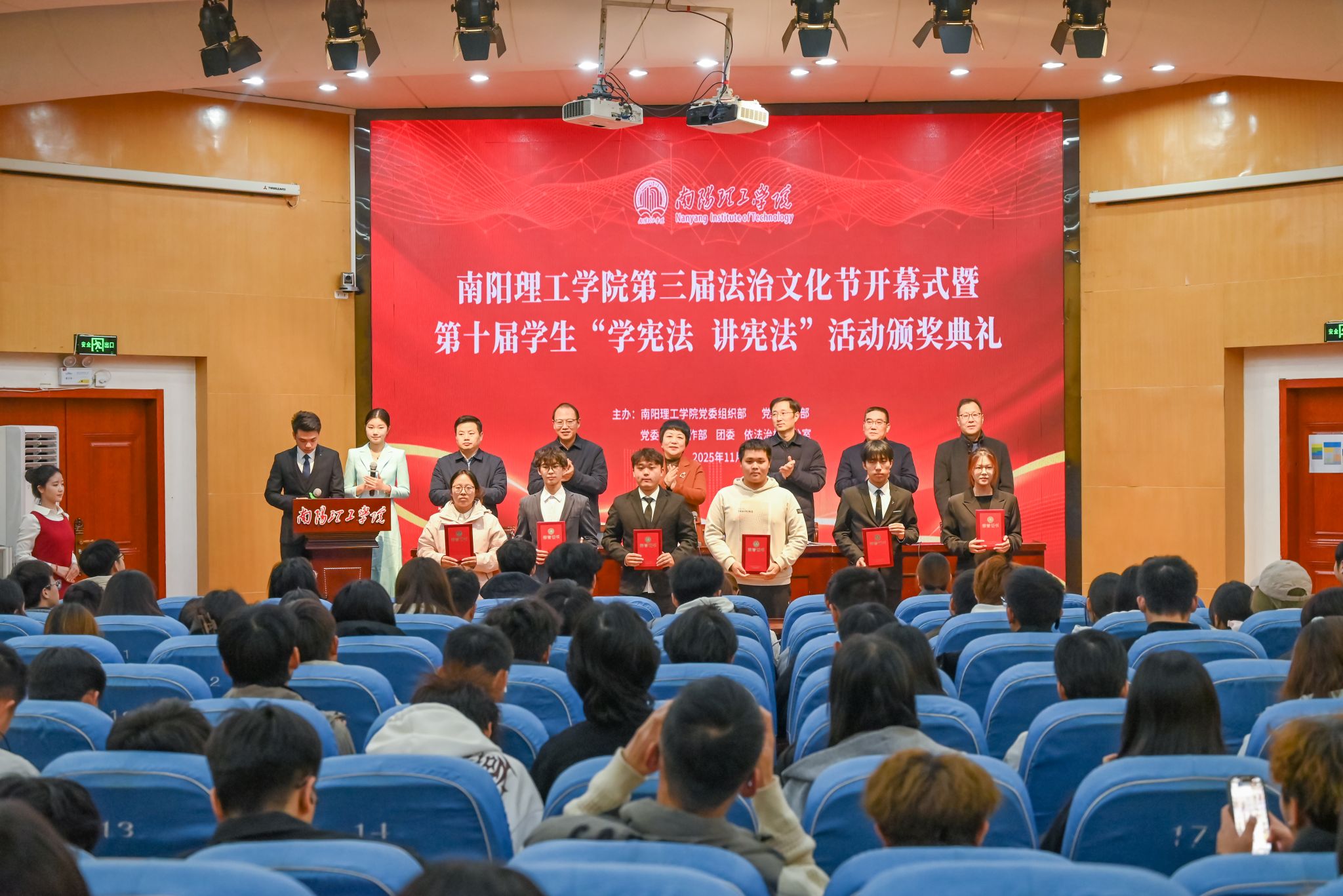 颁奖环节,与会领导为第十届“学宪法 讲宪法”系列活动获奖学生代表颁发荣誉证书。此次表彰涵盖演讲比赛、法治素养竞赛、法治情景剧比赛等多项赛事,旨在树立典型、表彰先进,进一步推动校园宪法学习宣传教育走深走实。