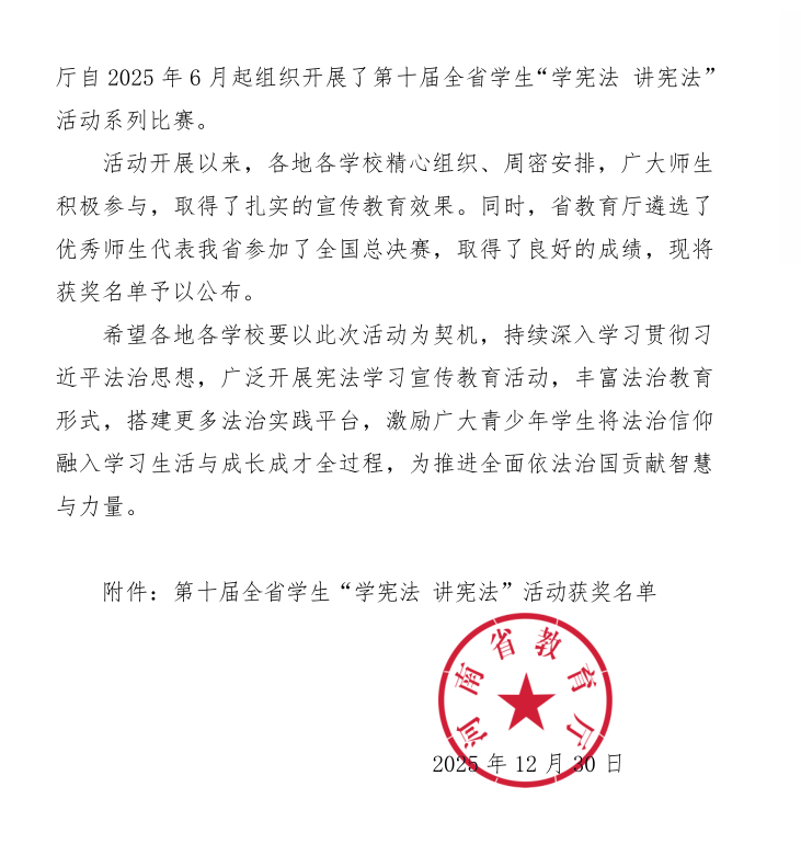 此次获奖,是我校师生个人不懈努力的成果,更是学校重视法治教育、深耕法治育人的体现。自全省学生“学宪法 讲宪法”活动开展以来,我校始终将宪法法治教育纳入人才培养体系,通过开展普法宣讲、组织竞赛备赛、搭建实践平台等多种形式,引导学生树立法治信仰、增强法治观念。