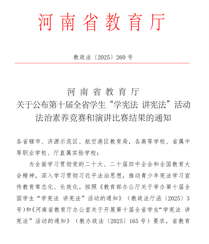 本网讯(特约记者/王冷)近日,河南省教育厅发布《关于公布第十届全省学生“学宪法 讲宪法”活动法治素养竞赛和演讲比赛结果的通知》(教政法【2025】260号),我校范蠡商学院学子张雅茹(指导老师:董博)在本次活动法治素养竞赛高校组赛事中表现优异,荣获一等奖,为学校赢得荣誉!