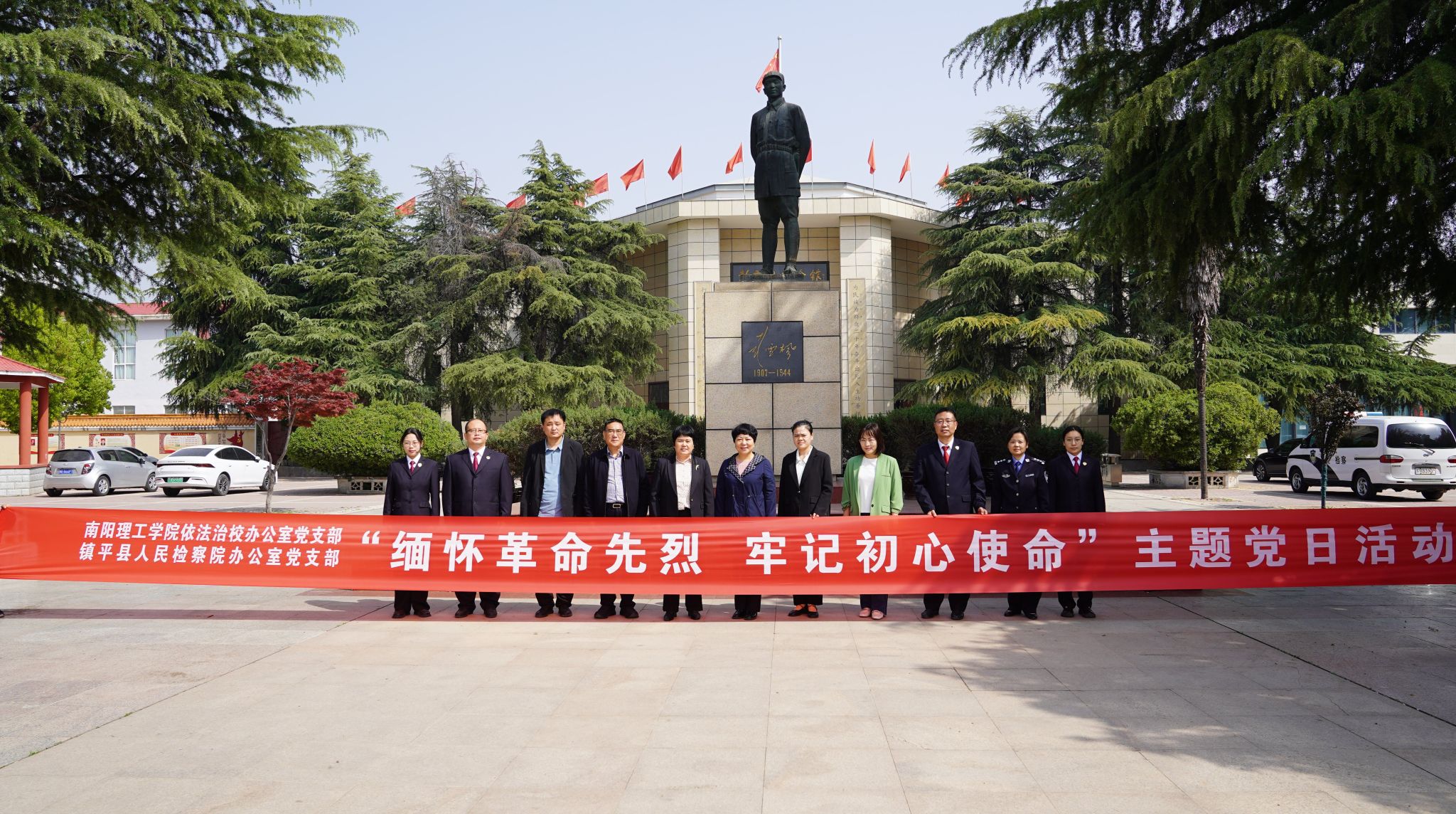 2025年4月10日上午,副校长高芳放带领依法治校办公室党支部全体党员一行与镇平县人民检察院办公室党支部,联合开展“缅怀革命先烈,牢记初心使命”主题党日活动。通过重温入党誓词、聆听彭雪枫将军革命故事,在沉浸式革命体验中强化政治担当。本次活动也是落实教育部、最高人民检察院《关于加强新时代检察机关与高等学校合作的意见》的重要举措。
